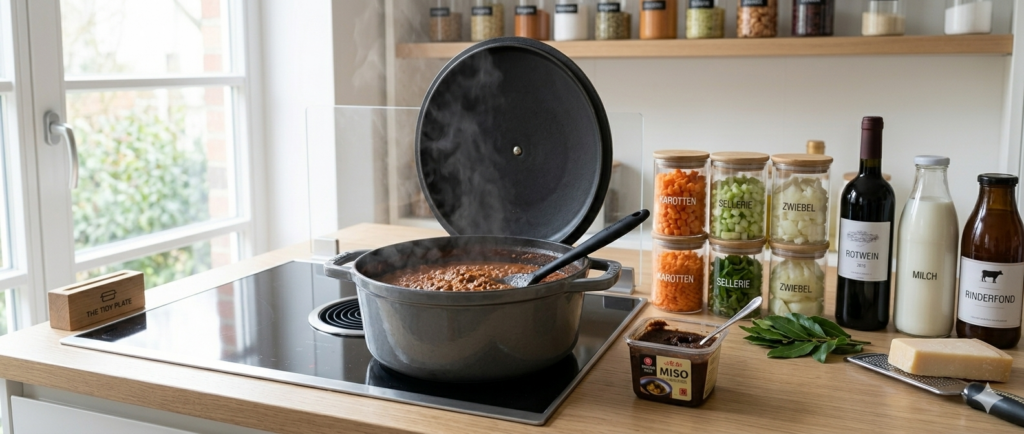 Der Umami-Cheat-Code: Wir fügen einen Teelöffel dunkle Miso-Paste hinzu. Sie intensiviert die Fleischigkeit massiv, ohne dass man das Miso herausschmeckt. Ein Schuss Vollmilch am Ende bindet die Säure und macht die Sauce unglaublich cremig.